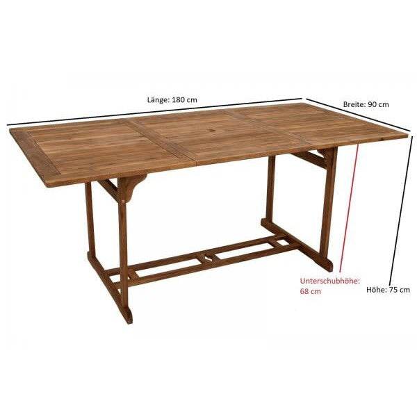 Der große Tisch ist ebenfalls aus Akazien-Hartholz gefertigt. In der Mitte verfügt der Tisch über ein Schirmloch. Der Tisch hat die feste Länge von 180cm (kein Ausziehtisch).