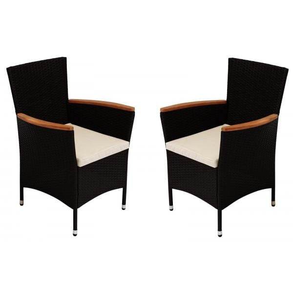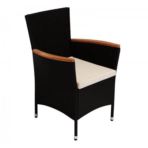 Die Sessel verfügen über einen stabilen Metallkern, bespannt mit robustem Polyrattan-Geflecht in der Farbe schwarz. Die Armlehnen aus Akazien-Hartholz verleihen dem Sessel die spezielle Note.