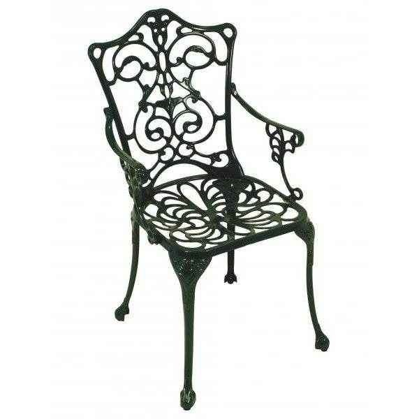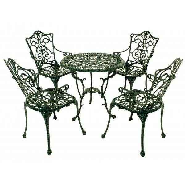 Alle Teile sind dunkelgrün beschichtet, das Set tellt mit seiner eleganten Erscheinung ein Schmuckstück für jeden Garten dar - entweder als bequeme Sitzgelegenheit oder einfach nur als geschmackvolles Dekoelement.