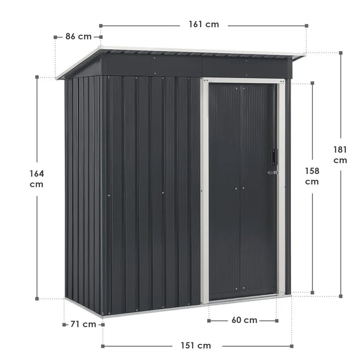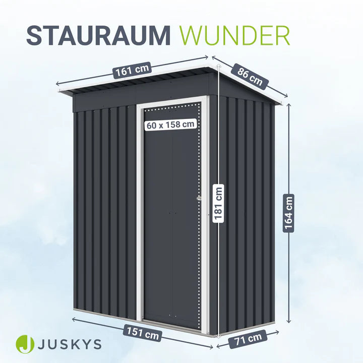 Mit dem modern gehaltenen Metall Gerätehaus S mit Pultdach in Grau sorgen Sie stilvoll für Ordnung im Garten oder auf der Terrasse. Verstauen Sie hier ganzjährig Werkzeuge, Gartengeräte oder Spielzeug sauber und trocken. Das kompakte Metallgerätehaus in 161 x 86 x 181 cm (Breite x Tiefe x Höhe) eignet sich ideal für den kleinen Garten am Reihenhaus. Aber auch im Schrebergarten oder beim Außenbereich auf dem Campingplatz erweist der Blechschuppen seine Dienste. Der Fundamentrahmen aus Stahl und die Werkzeughalterung runden die Ausstattung ab.
