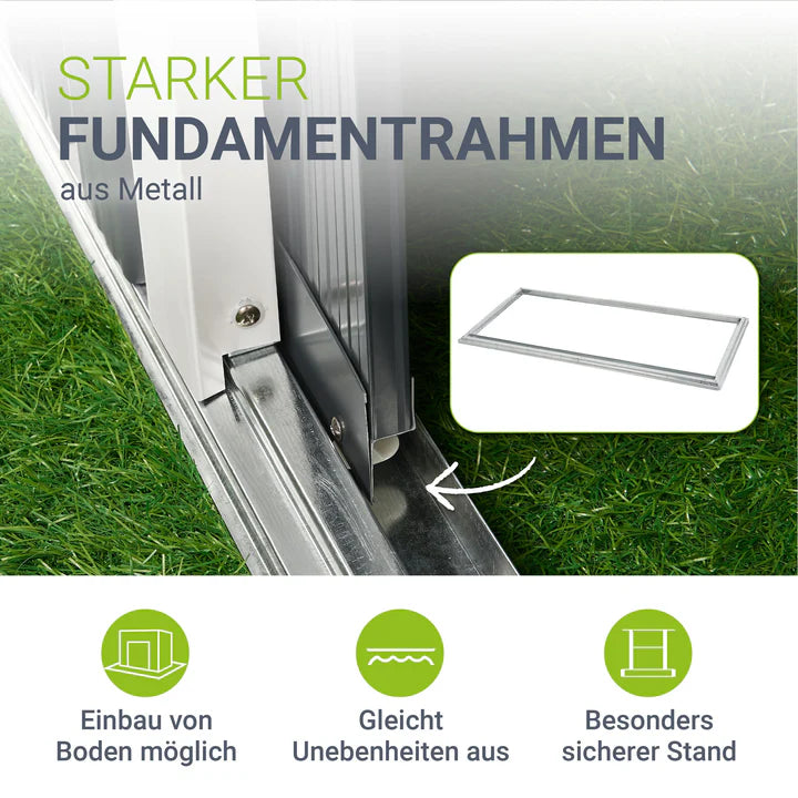 Für eine sichere Grundlage liefern wir einen stabilen Fundamentrahmen aus Stahl mit. Mit diesem gleichen Sie Unebenheiten im Gartenboden aus und sorgen für einen festen Stand. Auf dem verzinkten Stahlrahmen ist es möglich, einen zusätzlichen Boden - nicht im Lieferumfang enthalten - zu errichten.