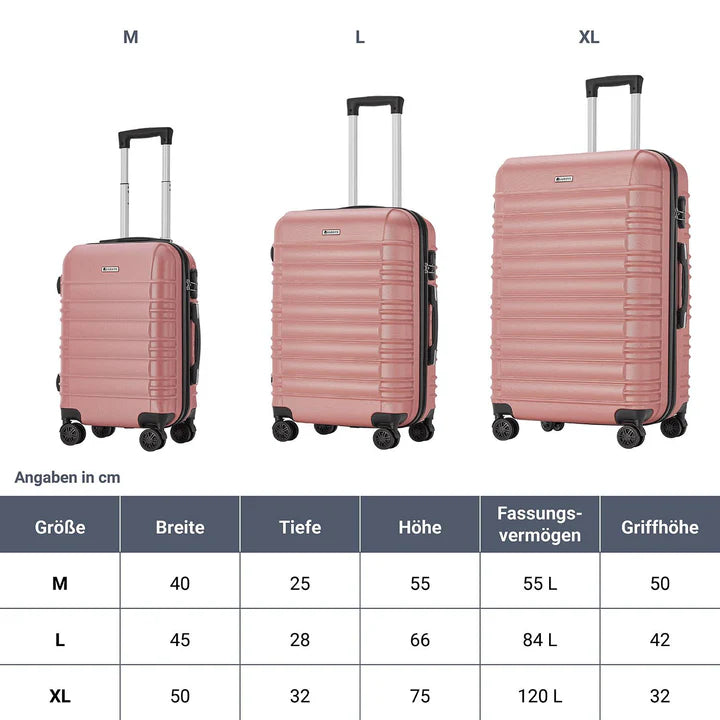 Das Set umfasst 3 Koffer in unterschiedlichen Größen. Vom kleinen 20“-Koffer M, mit einem Fassungsvermögen von 55 L für das Handgepäck, bis zum großen 28“-Koffer XL mit 120 L für den großen Urlaub, ist alles dabei.