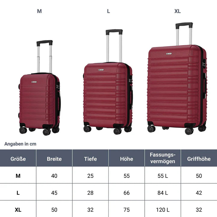 Das Set umfasst 3 Koffer in unterschiedlichen Größen. Vom kleinen 20“-Koffer M, mit einem Fassungsvermögen von 55 L für das Handgepäck, bis zum großen 28“-Koffer XL mit 120 L für den großen Urlaub, ist alles dabei.