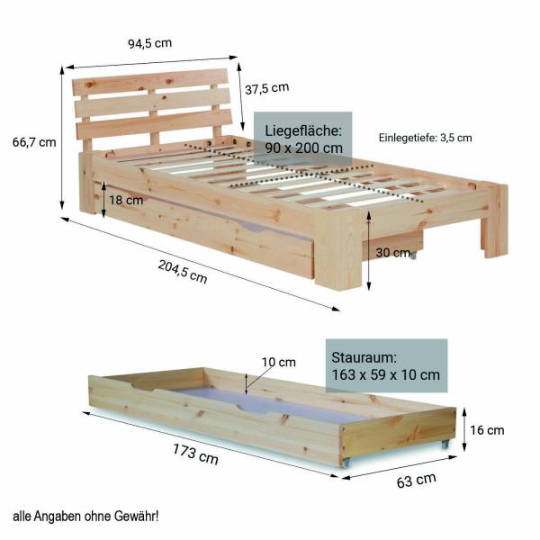 - Einzelbett 90 x 200 cm inklusive Bettschublade