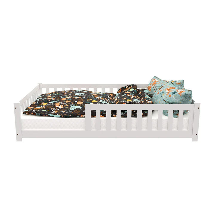 Das Einzelbett ist mit einem Gitter aus breiten Streben und abgerundeten Kanten ausgestattet. Damit bietet es Schutz und Sicherheit besonders wichtig für Kleinkinder.