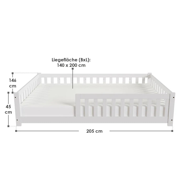 Entdecken Sie das stilvolle Kinderbett Naya 140x200 cm mit Lattenrost und Rausfallschutz! Als Bodenbett für Mädchen und Jungen bietet es einen sicheren und gemütlichen Schlafplatz, wobei das stabile Bettgestell aus Holz für Langlebigkeit sorgt. Das bodentiefe, kindgerechte Design zaubert ein liebevolles Ambiente ins Kinderzimmer und fördert die kindliche Entwicklung. Schaffen Sie einen Ort zum Wohlfühlen und ermöglichen Sie Ihrem Kind erholsame Nächte.