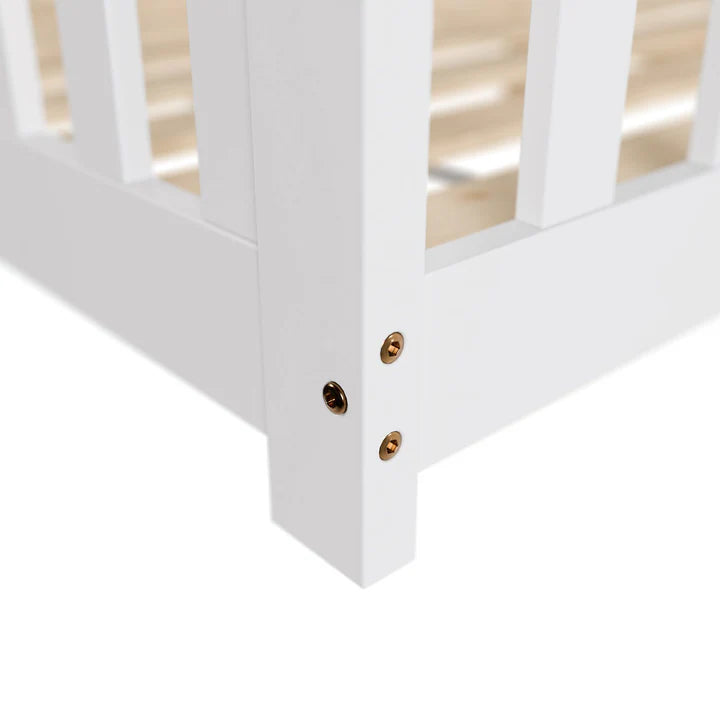 Das Einzelbett ist mit einem Gitter aus breiten Streben und abgerundeten Kanten ausgestattet. Damit bietet es Schutz und Sicherheit besonders wichtig für Kleinkinder.