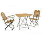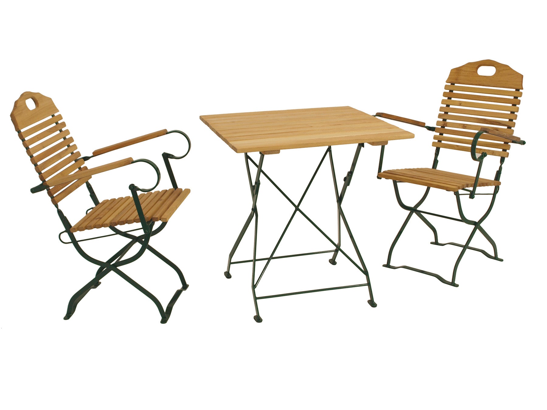 Bestehend aus 2x Sessel mir Armlehnen und 1x Klapptisch 70x70cm quadratisch.