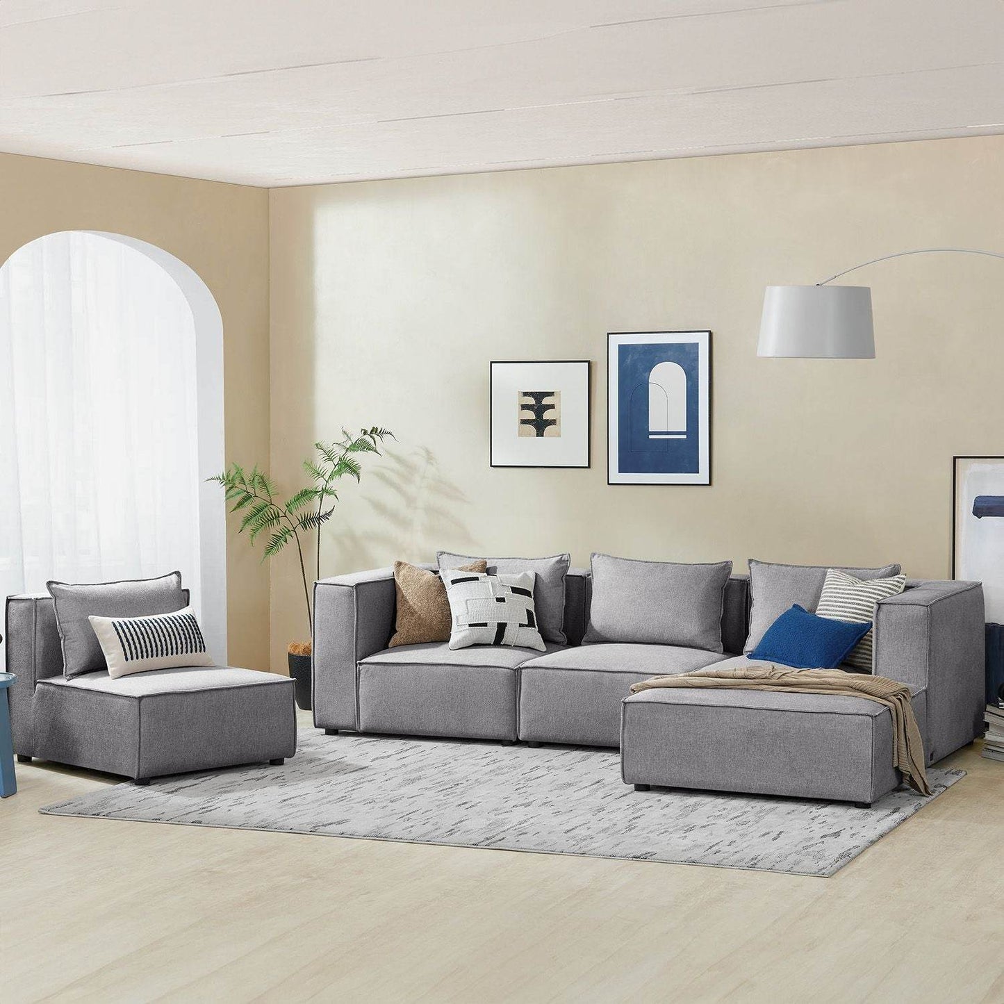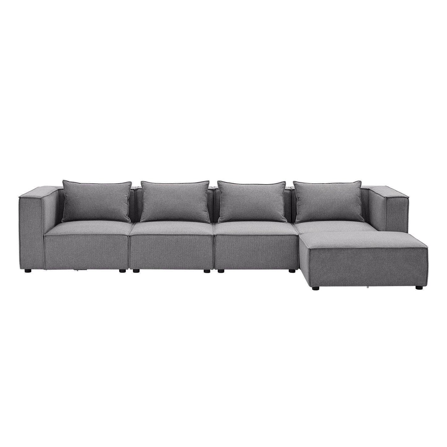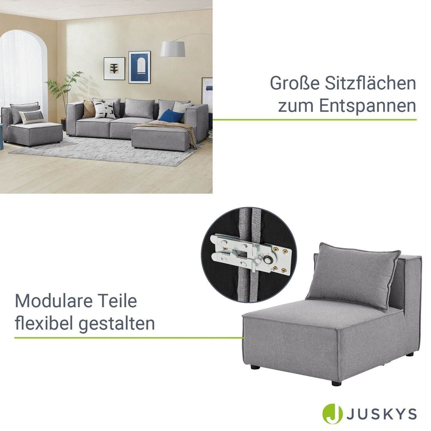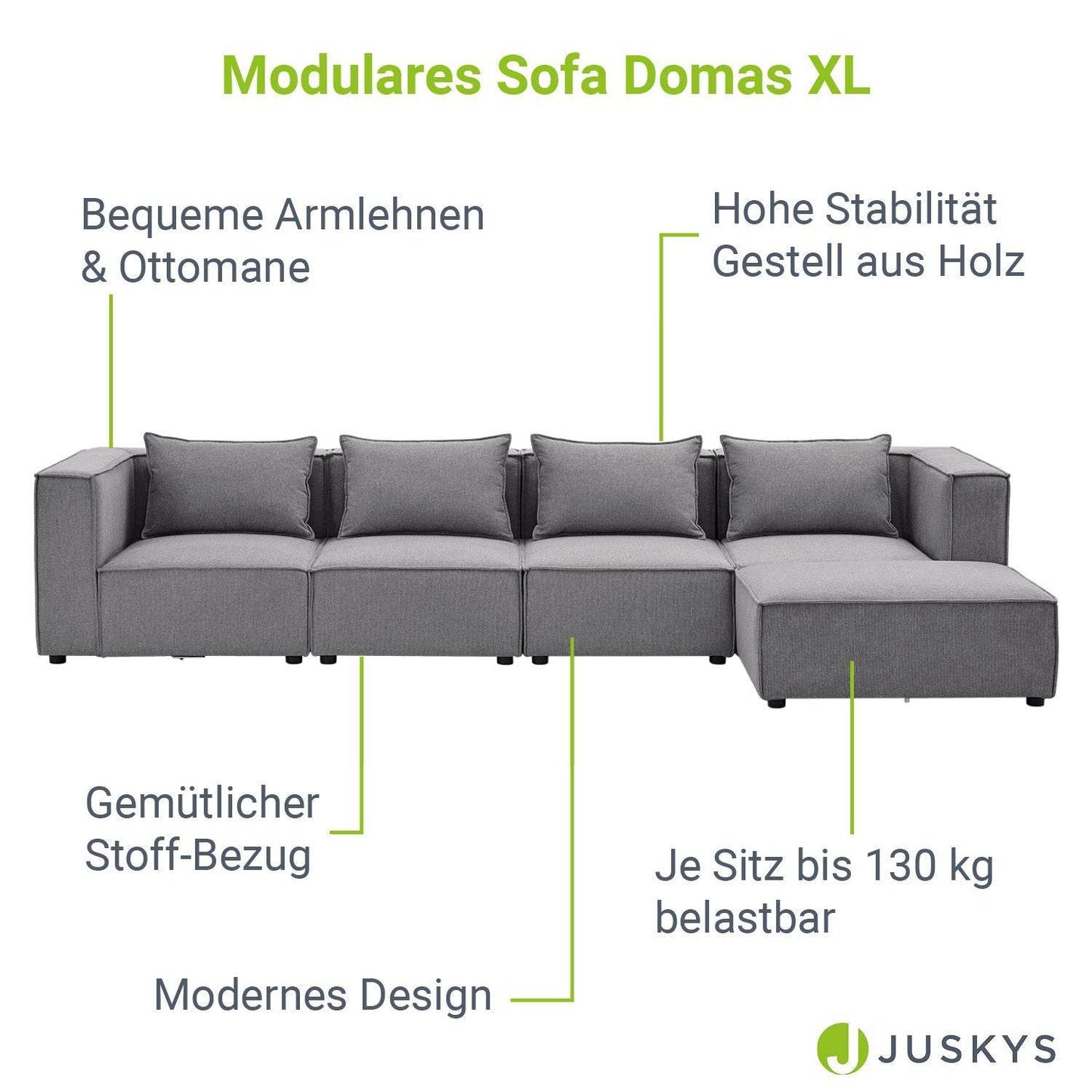 Das modulare Sofa Domas XL mit Stoff Bezug in Dunkelgrau ist der perfekte Rückzugsort in deinem Wohnzimmer. Gönne dir pure Entspannung auf dem modern designten 4 Sitzer Sofa mit Ottomane, Armlehnen und Kissen. Und erlebe erholsame Stunden mit deinen Liebsten. Dank des modularen Aufbaus kannst du das Sofa auch einfach zu einer anderen Größe kombinieren.