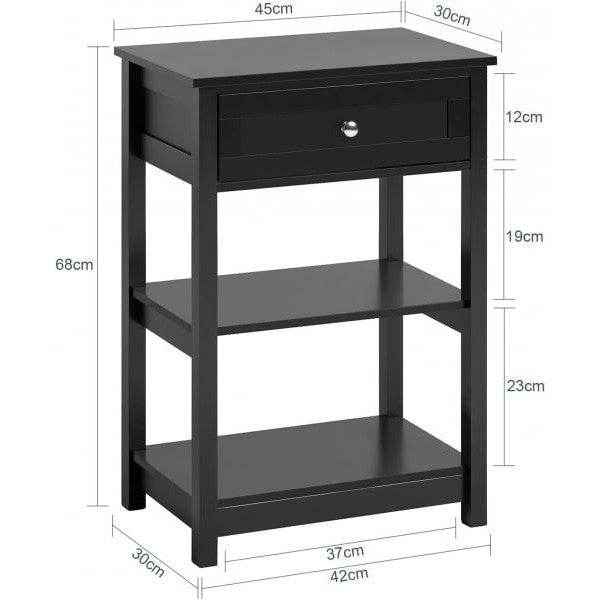 Der Beistelltisch mit einer Schublade und zwei Ablagen erweitert elegant Ihren Stauraum und ist durch die Kombination aus modernem Design und Funktionalität ein Möbelstück. dass Ihren Wohnbereich stilvoll aufwertet.