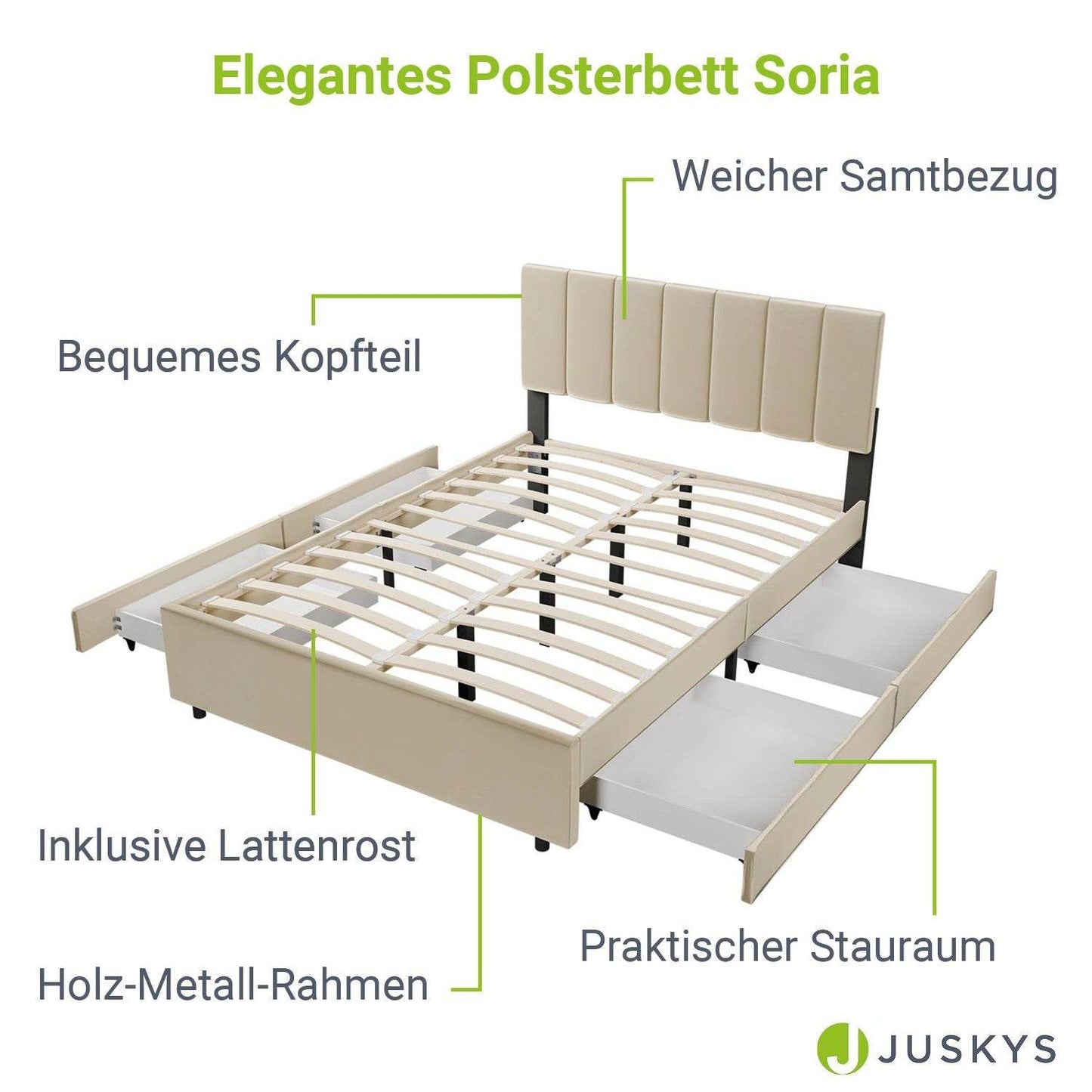 Schlafen Sie komfortabel und stilvoll im Samt Polsterbett Soria 140 x 200 cm in Beige. Das moderne Bett bietet Ihnen nicht nur einen eleganten Ort zum Erholen, sondern auch einen praktischen Stauraum mit Schubladen für Ihre persönlichen Dinge. Es wird komplett mit einem Lattenrost geliefert und ist somit bereit, Ihr Schlafzimmer auf das nächste Level zu bringen. Worauf warten Sie noch? Zudem eignet sich das Stauraumbett auch perfekt als Jugendbett für Teenager.