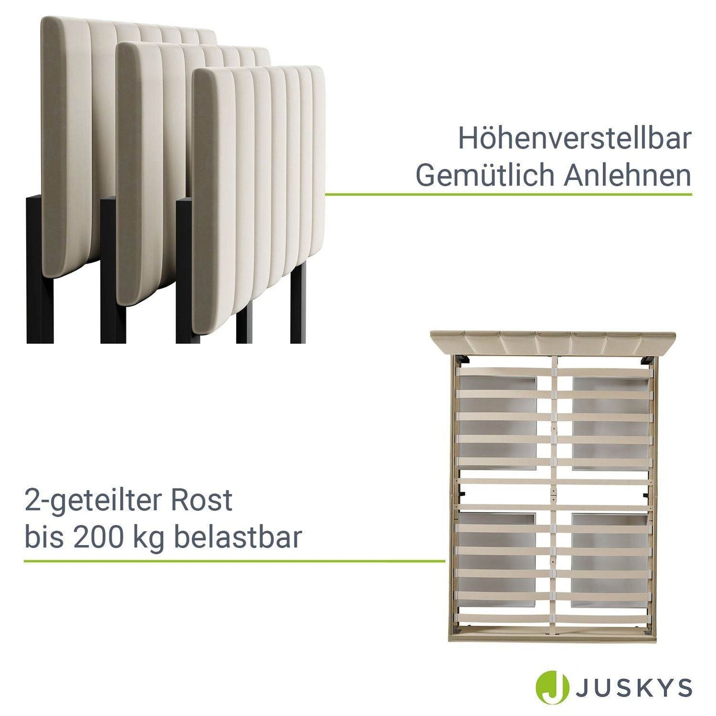Das 140x200 cm große Bett in zeitlosem Farbton passt zu jedem Einrichtungsstil und lässt Ihr Schlafzimmer noch gemütlicher wirken. Der Bezug aus Samtstoff fühlt sich angenehm weich an.