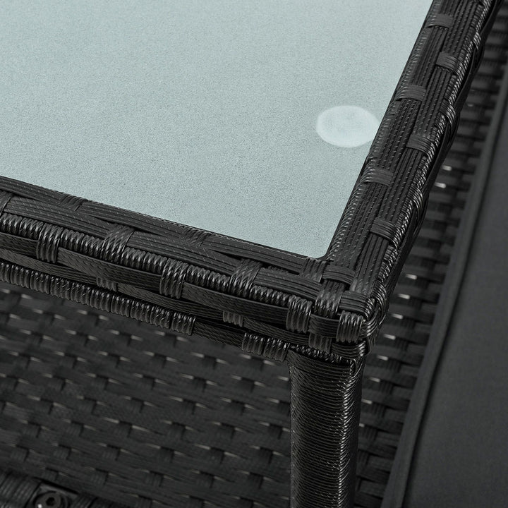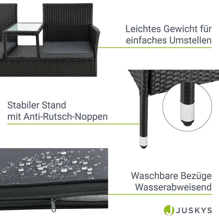 Ausgestattet mit weichen Polstern sowie hohen Arm- und Rückenlehnen bietet die Sitzgarnitur einen perfekten Komfort. Zwischen den zwei Plätzen befindet sich ein kleiner Abstelltisch mit einer 5 mm stabilen Glasplatte. Hier platzieren Sie ein kühles Getränk an einem warmen Sommertag.
