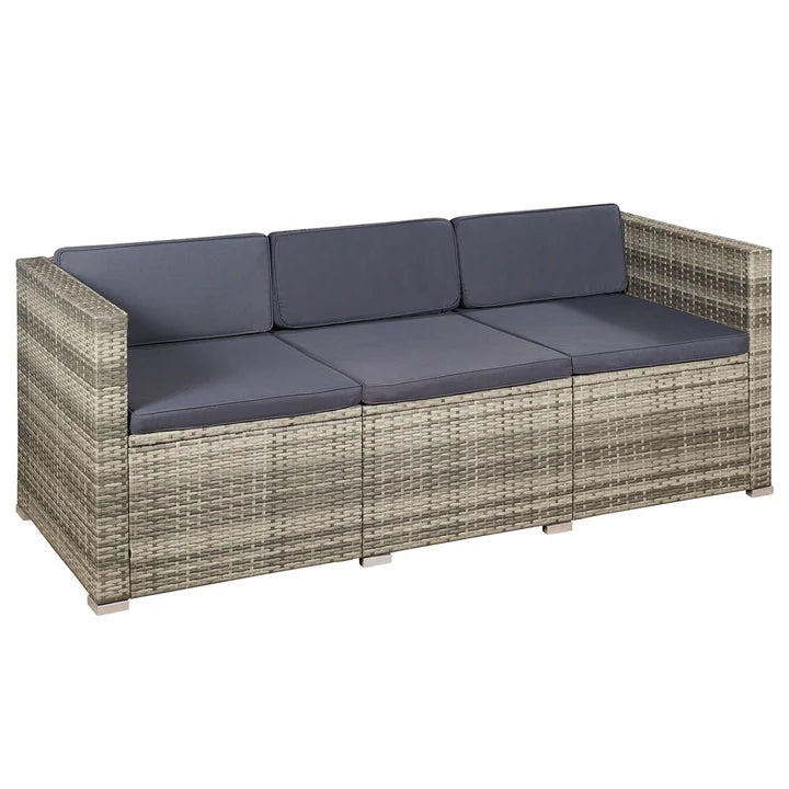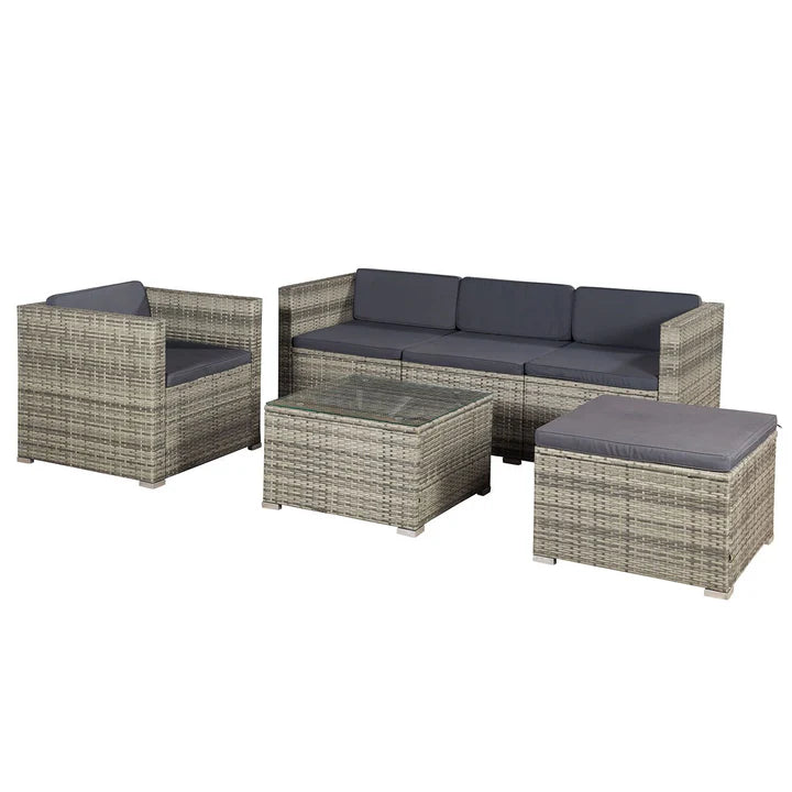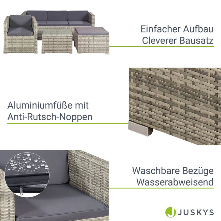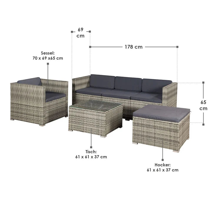 Das grau-melierte Polyrattan Geflecht eignet sich perfekt für Gartenmöbel. Das reiß- und zugfeste Material hält Regen, hohe Temperaturen und intensive Sonneneinstrahlung mühelos aus. Somit muss die Lounge bei Regen nicht hektisch reingeräumt werden. Sie kann bei Wind und Wetter im Garten stehen bleiben. Das Kunststoffgeflecht wird mit der Zeit nicht porös und bleibt dauerhaft elastisch. Durch die hohe UV-Beständigkeit behält Polyrattan über Jahre seine schöne Farbe. Darüber hinaus ist es sehr pflegeleicht. Das Geflecht lässt sich bequem mit einem feuchten Tuch und mildem Spülmittel sauber halten.