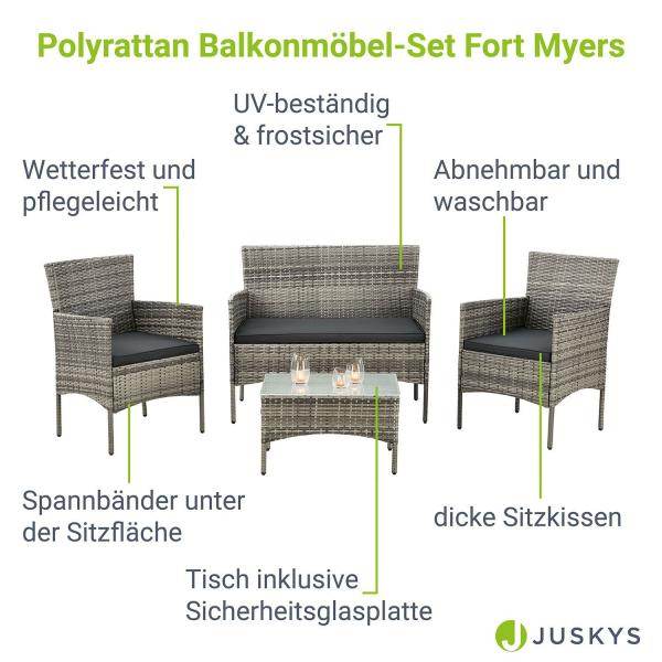 Die Polyrattan Sitzgruppe Fort Myers (grau meliert mit dunkelgrauen Bezügen) dient als gemütliche Lounge für 4 Personen. Mit der edlen Rattan-Optik verschönert sie jeden Garten, Terrasse oder Balkon. Ausgestattet mit Rückenlehne und Auflagen ist die Gartengarnitur perfekt, um dort viele Stunden mit der Familie und Freunden zu verbringen. Das 4-teilige Gartenmöbelset mit stabilem Metall-Gestell beinhaltet eine 2er-Bank, zwei Sessel und einen kleinen Beistelltisch mit Glasplatte. Das Balkonset eignet sich, um Gäste stilvoll zu empfangen. Stellen Sie Getränke und Snacks auf dem Tisch bereit und genießen Sie zusammen den Sommer.