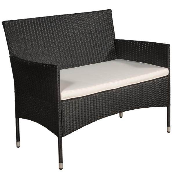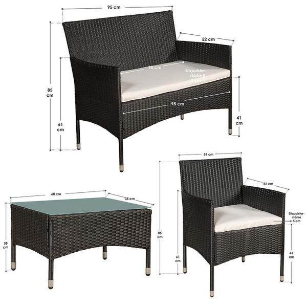 Die Polyrattan Sitzgruppe Fort Myers (schwarz mit creme-weißen Bezügen) dient als gemütliche Lounge für 4 Personen. Mit der edlen Rattan-Optik verschönert sie jeden Garten, Terrasse oder Balkon. Ausgestattet mit Rückenlehne und Auflagen ist die Gartengarnitur perfekt, um dort viele Stunden mit der Familie und Freunden zu verbringen. Das 4-teilige Gartenmöbelset mit stabilem Metall-Gestell beinhaltet eine 2er-Bank, zwei Sessel und einen kleinen Beistelltisch mit Glasplatte. Das Balkonset eignet sich, um Gäste stilvoll zu empfangen. Stellen Sie Getränke und Snacks auf dem Tisch bereit und genießen Sie zusammen den Sommer.
