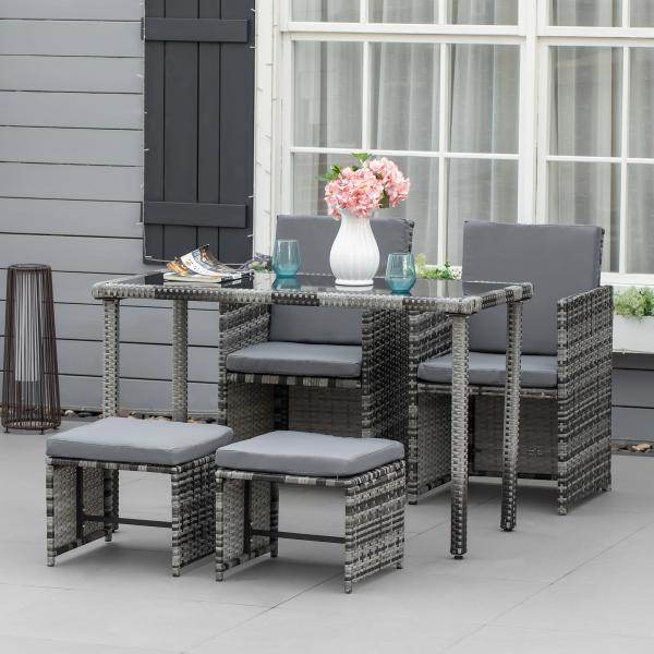 - 5-teilige Sitzgruppe: Das Set beinhaltet einen Tisch, zwei Stühle sowie zwei Hocker samt Sitzkissen. Geeignet ist es für den Einsatz im Innen- oder Außenbereich.