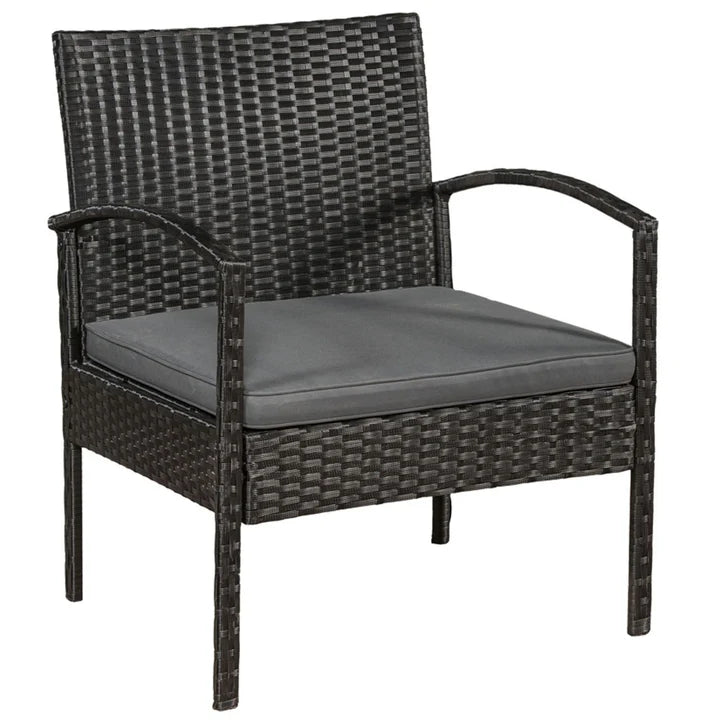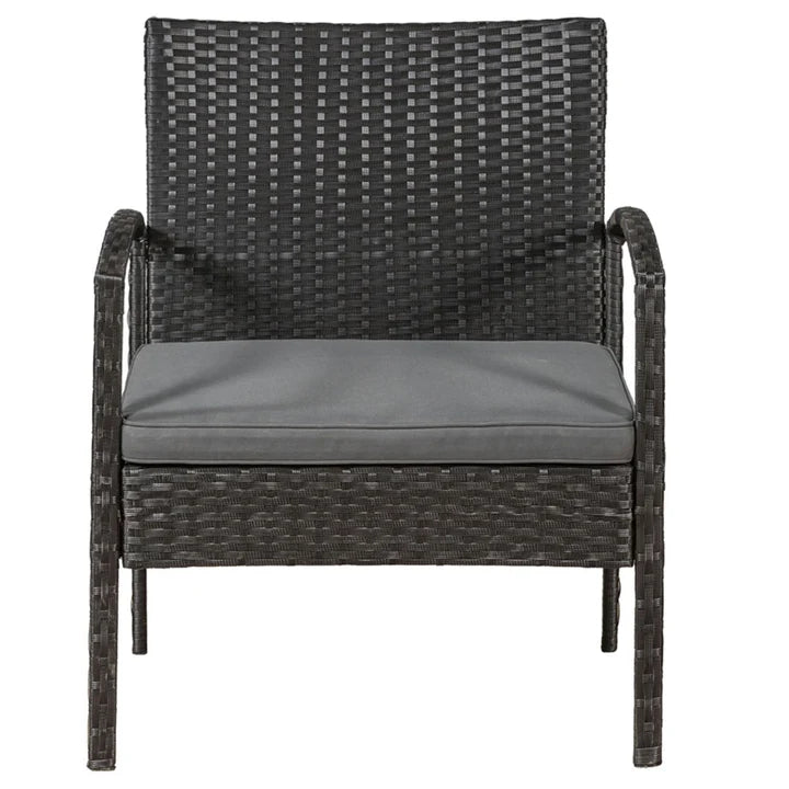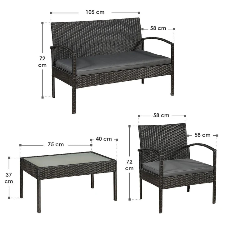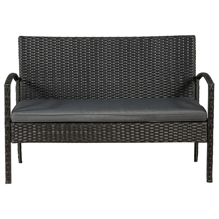 Die zeitlos moderne Polyrattan Sitzgruppe Trinidad schwarz mit grauen Bezügen bietet draußen einen bequemen Sitzplatz für 4 Personen. Im 4-teiligen Gartenmöbelset sind ein Sofa, zwei Sessel und ein Beistelltisch mit einer edlen Glasplatte enthalten. Ob im Garten, auf der Terrasse oder dem Balkon, die Rattan-Optik wirkt ansprechend und wertet jeden Außenbereich optisch auf. Zusammen mit den Sitzkissen liefern die stabilen Terrassenmöbel einen hohen Sitzkomfort über mehrere Stunden hinweg. Zugleich ist die Sitzgruppe überaus platzsparend und damit ideal als Balkonmöbel geeignet.