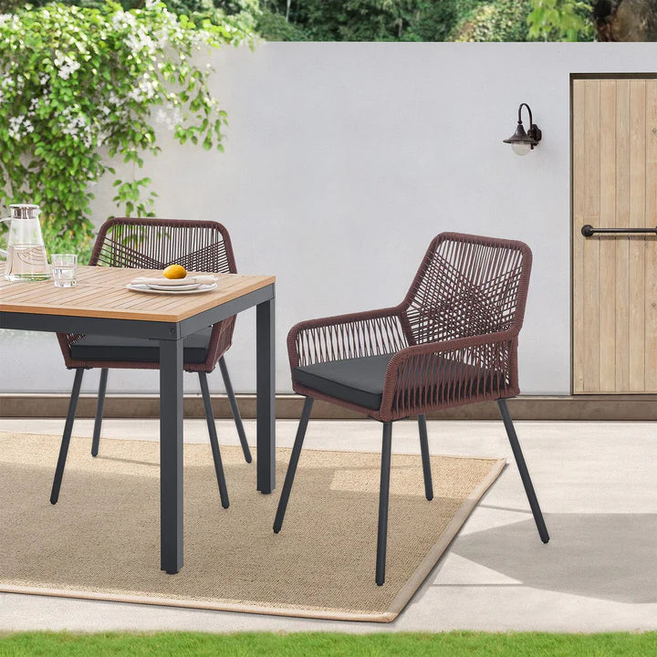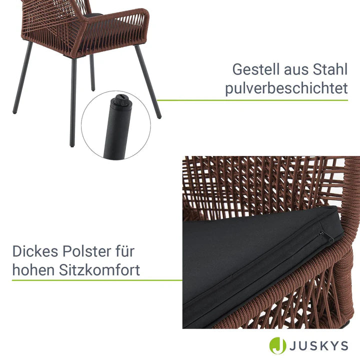 Das 2er Set Rope Stühle mit Sitz- & Rückenkissen in Dunkelgrau ist ideal als elegante und bequeme Sitzmöglichkeit für Ihren Garten geeignet. Die Möbel verfügen über ein Seilgeflecht, welches nicht nur dekorativ ist, sondern auch den Komfort erhöht. Das Grundgerüst ist aus robustem und pulverbeschichtetem Stahl gefertigt. Dadurch sind die Sitzmöbel korrosionsarm, kratzfest und mit bis zu 160 kg belastbar. Der Lieferumfang umfasst neben den Stühlen auch die passenden Sitzpolster für noch mehr Komfort. Die Polster sind abziehbar und dadurch pflegeleicht.