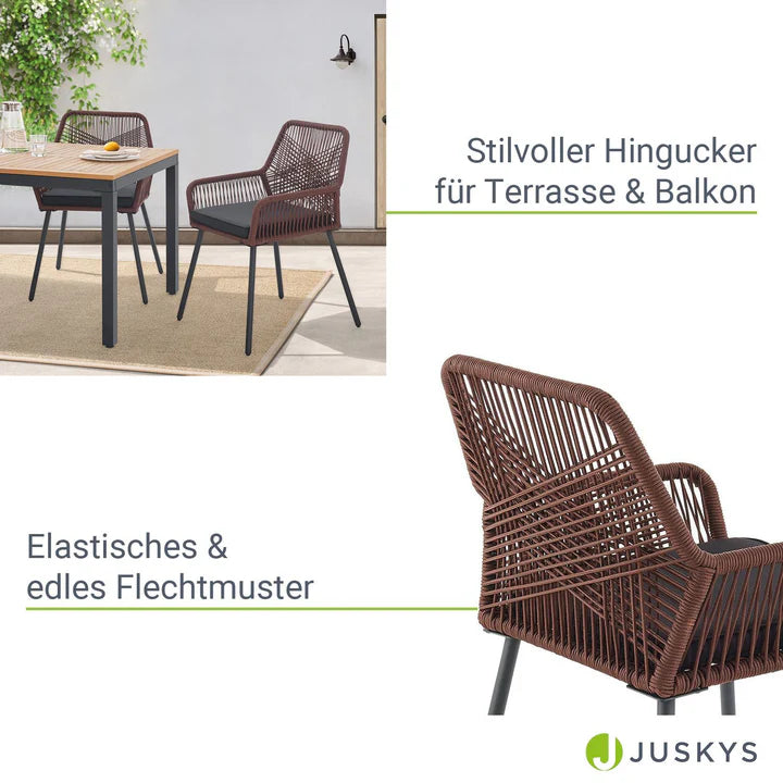 Das elastische Seilgeflecht sorgt zusammen mit den dicken Sitz- und Rückenkissen für einen besonders hohen Sitzkomfort der Balkonstühle.