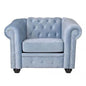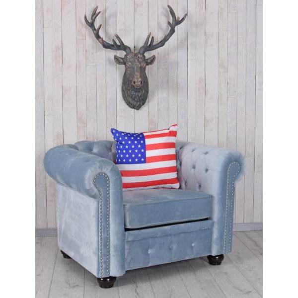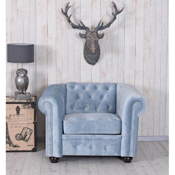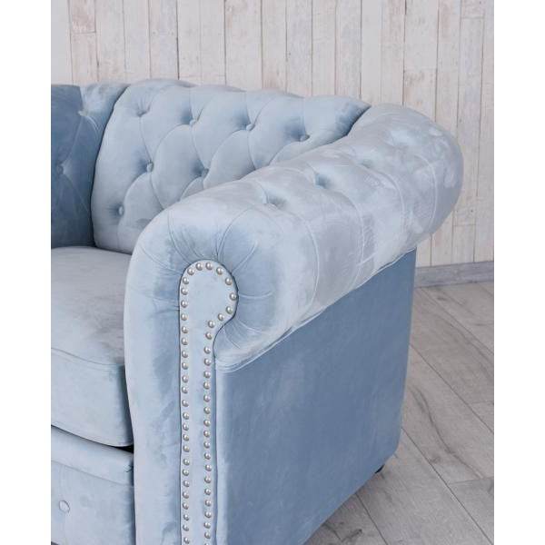 Die Sessel verfügt über ein grosses Sitzkissen, mit Knöpfen verzierte Lehnenfläche und den Nietenbesatz.