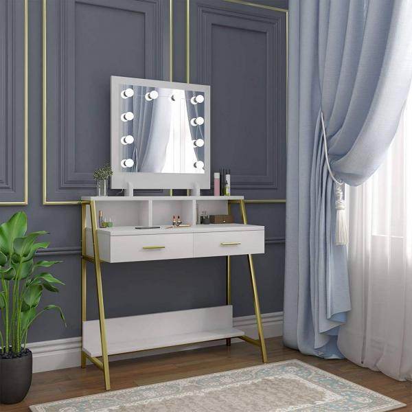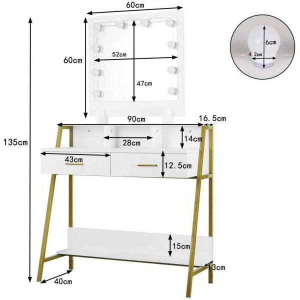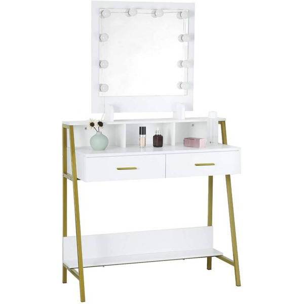 Schminktisch LED Spiegel 2 Schubladen Weiss Gold