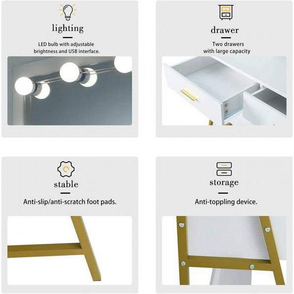 LED-Lampen: Der Spiegel der Frisierkommode ist mit 10 LED-Lampen ausgestattet. Die Lampen bieten mit natürlichem und sanftem Licht eine helle und klare Sicht, sodass Sie ein perfektes Make-up auftragen können, auch wenn der Raum nicht ausreichend beleuchtet ist.