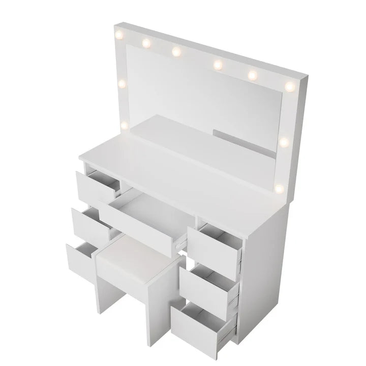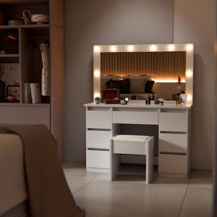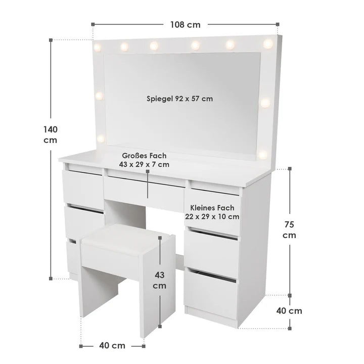 Mit 7 Schubladen bietet der Tisch reichlich Platz für Make-up, und Styling-Zubehör – alles ordentlich griffbereit.