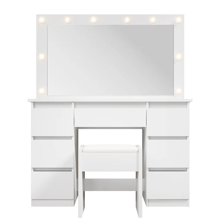 Der Schminktisch Lilia inkl. Hocker Melly in Weiß überzeugt mit modernem Design und großzügigem Stauraum. Mit sieben Schubladen und einer großen Spiegeloberfläche bietet der Kosmetiktisch viel Platz für Make-up, und Pflegeprodukte. Die große Spiegeloberfläche mit 10 LED-Leuchten, die individuell dimmbar und 3 Farbtemperaturen haben, sorgt jederzeit für perfekte Lichtverhältnisse. Dank kompakter Maße eignet sich die Spiegelkommode ideal für Schlafzimmer oder Jugendzimmer. Aus melaminbeschichteter Spanplatte gefertigt, ist der Frisiertisch pflegeleicht und langlebig. Ob als Schminktisch für Teenager oder elegante Frisierkommode – Lilia ist die praktische und stilvolle Lösung für jeden Tag.