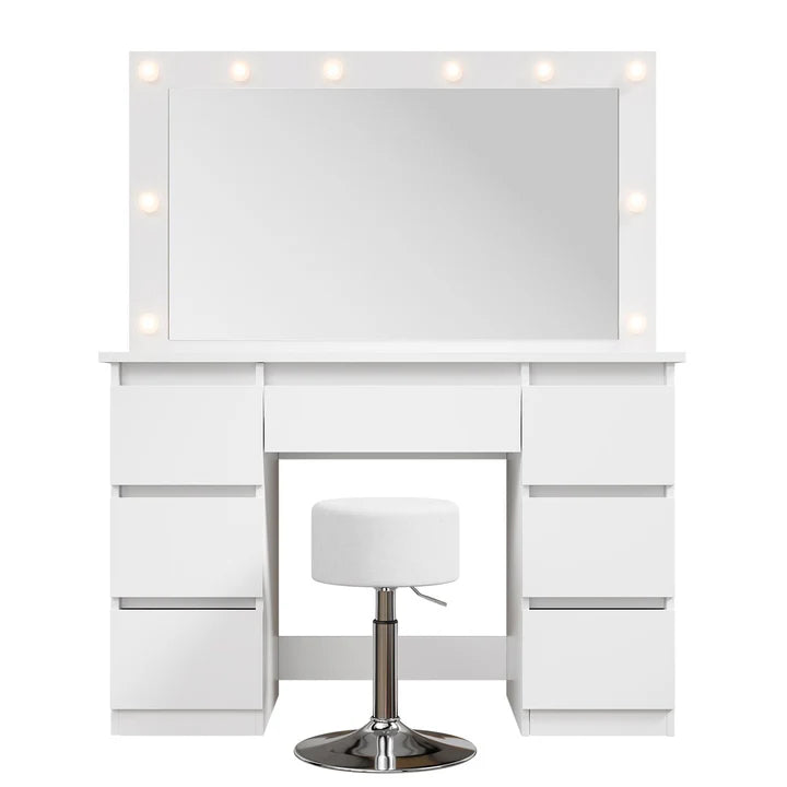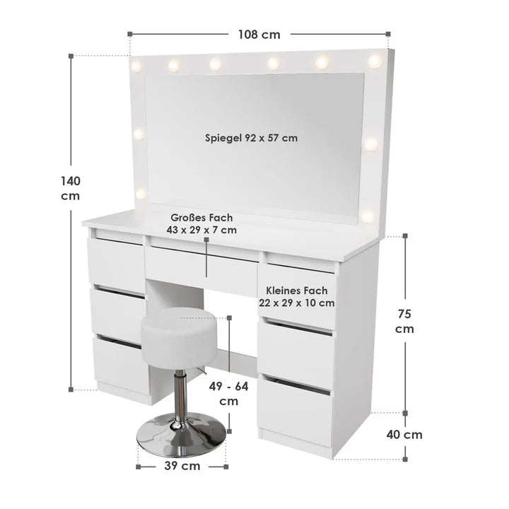 Der Schminktisch Lilia inkl. Hocker Tonia in Weiß überzeugt mit modernem Design und großzügigem Stauraum. Mit sieben Schubladen und einer großen Spiegeloberfläche bietet der Kosmetiktisch viel Platz für Make-up, und Pflegeprodukte. Die große Spiegeloberfläche mit 10 LED-Leuchten, die individuell dimmbar und 3 Farbtemperaturen haben, sorgt jederzeit für perfekte Lichtverhältnisse. Dank kompakter Maße eignet sich die Spiegelkommode ideal für Schlafzimmer oder Jugendzimmer. Aus melaminbeschichteter Spanplatte gefertigt, ist der Frisiertisch pflegeleicht und langlebig. Ob als Schminktisch für Teenager oder elegante Frisierkommode – Lilia ist die praktische und stilvolle Lösung für jeden Tag.