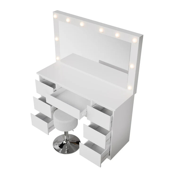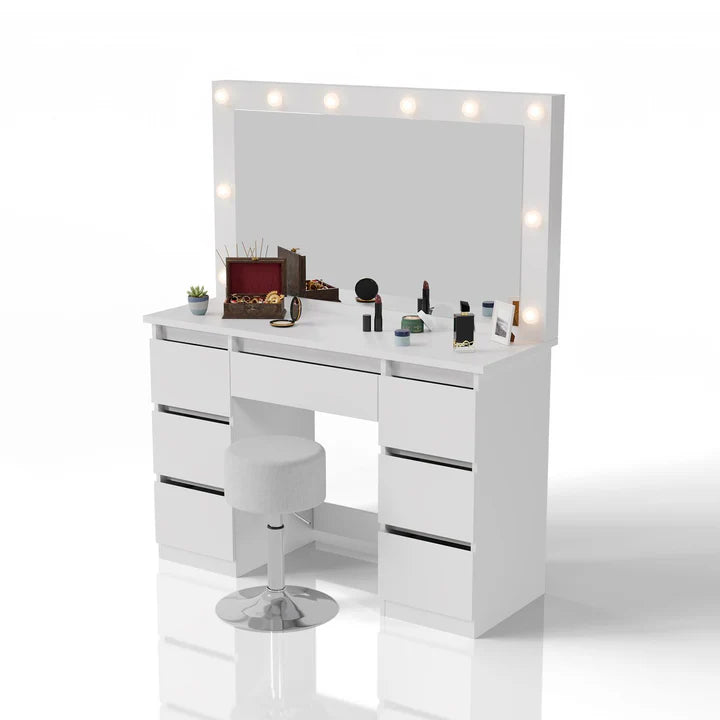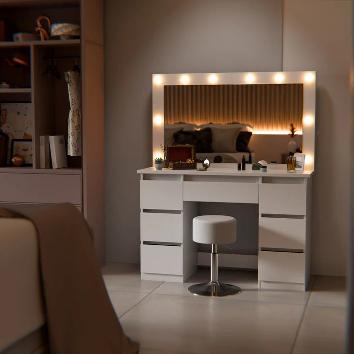 Mit 7 Schubladen bietet der Tisch reichlich Platz für Make-up, und Styling-Zubehör – alles ordentlich griffbereit.