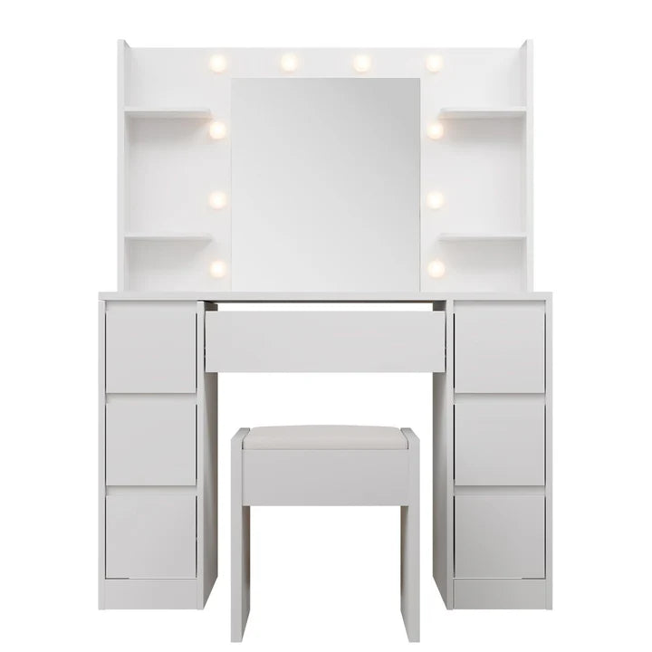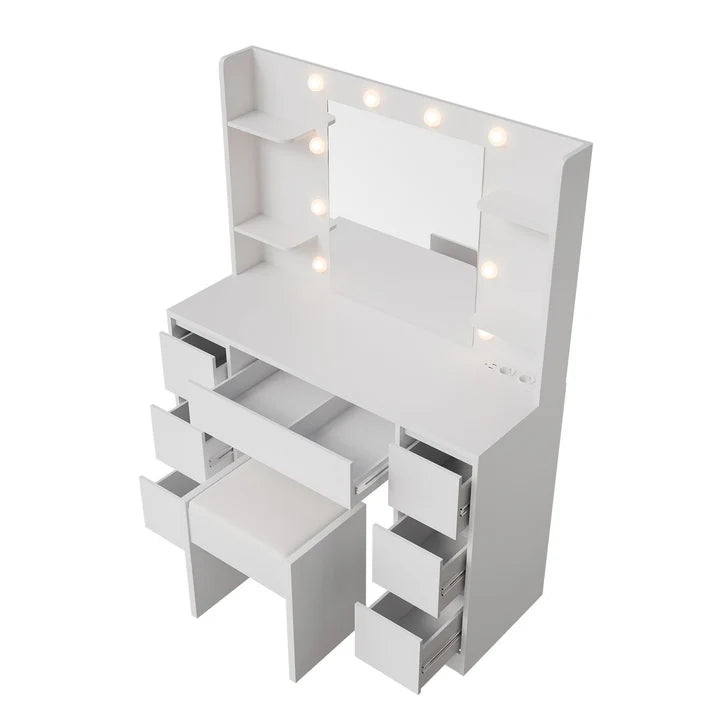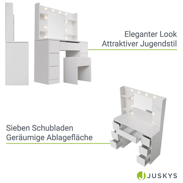 Mit 7 Schubladen und mehreren offenen Ablagen bietet der Tisch reichlich Platz für Make-up, und Styling-Zubehör – alles ordentlich griffbereit.