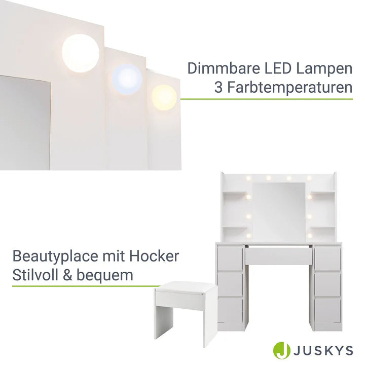 Ein Platz nur für dich – für Selbstpflege, Ordnung und tägliche Beauty-Momente. Der Juskys Schminktisch Malia mit LED & Hocker Melly ist mehr als ein Möbelstück – er ist deine persönliche Wohlfühl-Zone. Das moderne Design in Weiß passt perfekt ins Schlafzimmer oder Ankleidezimmer und fügt sich stilvoll in jedes Interieur ein. Mit 7 geräumigen Schubladen und offenen Regalen bietet der Tisch ausreichend Stauraum für Make-up, und Pflegeprodukte. Die große Spiegeloberfläche mit 10 LED-Leuchten, die individuell dimmbar und 3 Farbtemperaturen haben, sorgt jederzeit für perfekte Lichtverhältnisse. Über den integrierten USB-Anschluss lassen sich auch Handy oder Beauty-Gadgets laden.