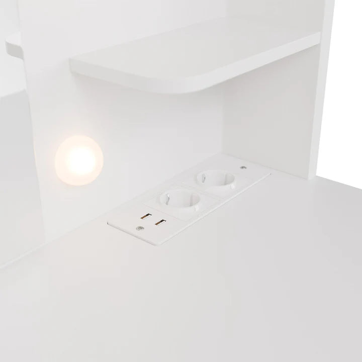 Der integrierte USB-Anschluss macht den Malia besonders alltagstauglich: Lade Handy, Spiegel oder Stylingtools direkt am Tisch. Die LED-Spiegelbeleuchtung mit individuell einstellbarer Helligkeit und 3 Farbtemperaturen bringt Studio-Feeling in dein Zuhause – ganz ohne Kabelsalat.
