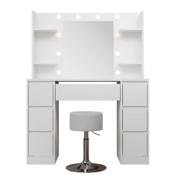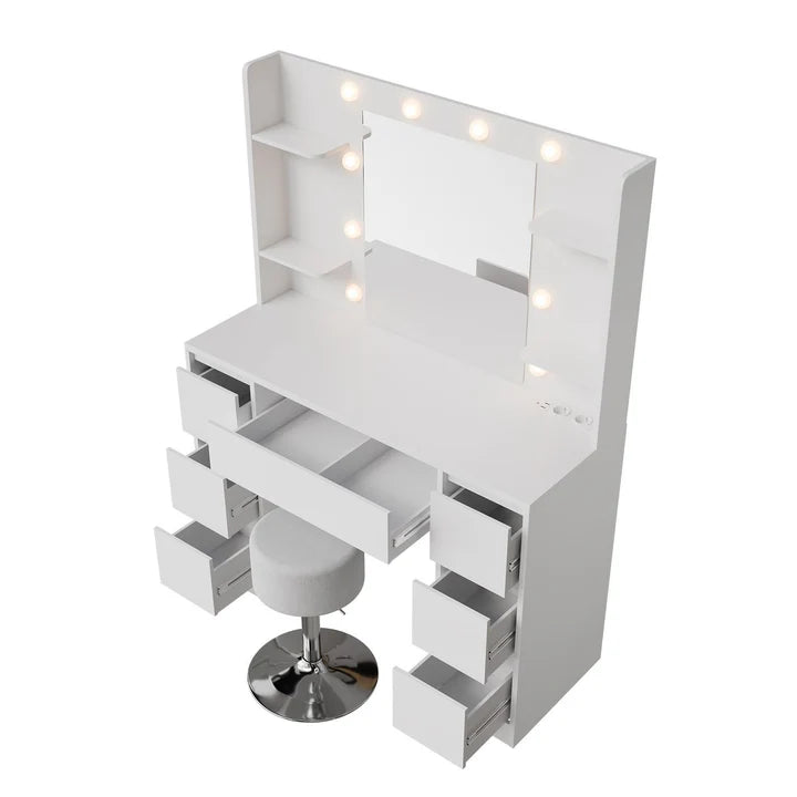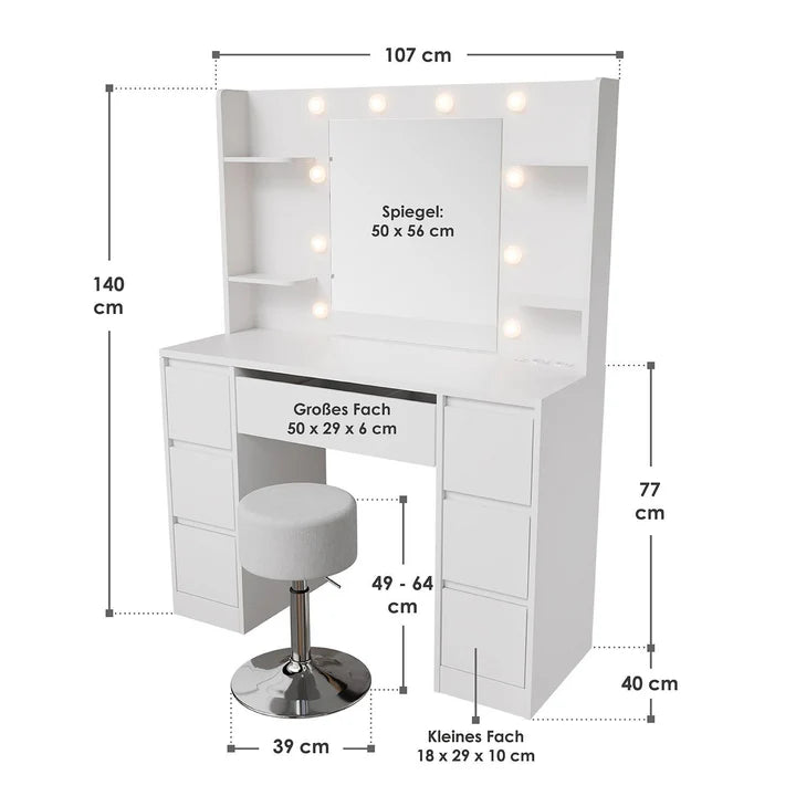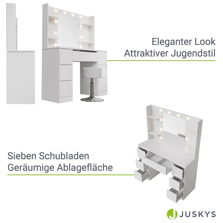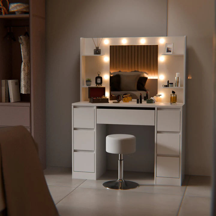 Mit 7 Schubladen und mehreren offenen Ablagen bietet der Tisch reichlich Platz für Make-up, und Styling-Zubehör – alles ordentlich griffbereit.