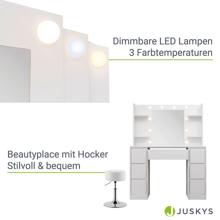 Ein Platz nur für dich – für Selbstpflege, Ordnung und tägliche Beauty-Momente. Der Juskys Schminktisch Malia mit LED & Hocker Tonia ist mehr als ein Möbelstück – er ist deine persönliche Wohlfühl-Zone. Das moderne Design in Weiß passt perfekt ins Schlafzimmer oder Ankleidezimmer und fügt sich stilvoll in jedes Interieur ein. Mit 7 geräumigen Schubladen und offenen Regalen bietet der Tisch ausreichend Stauraum für Make-up, und Pflegeprodukte. Die große Spiegeloberfläche mit 10 LED-Leuchten, die individuell dimmbar und 3 Farbtemperaturen haben, sorgt jederzeit für perfekte Lichtverhältnisse. Über den integrierten USB-Anschluss lassen sich auch Handy oder Beauty-Gadgets laden.