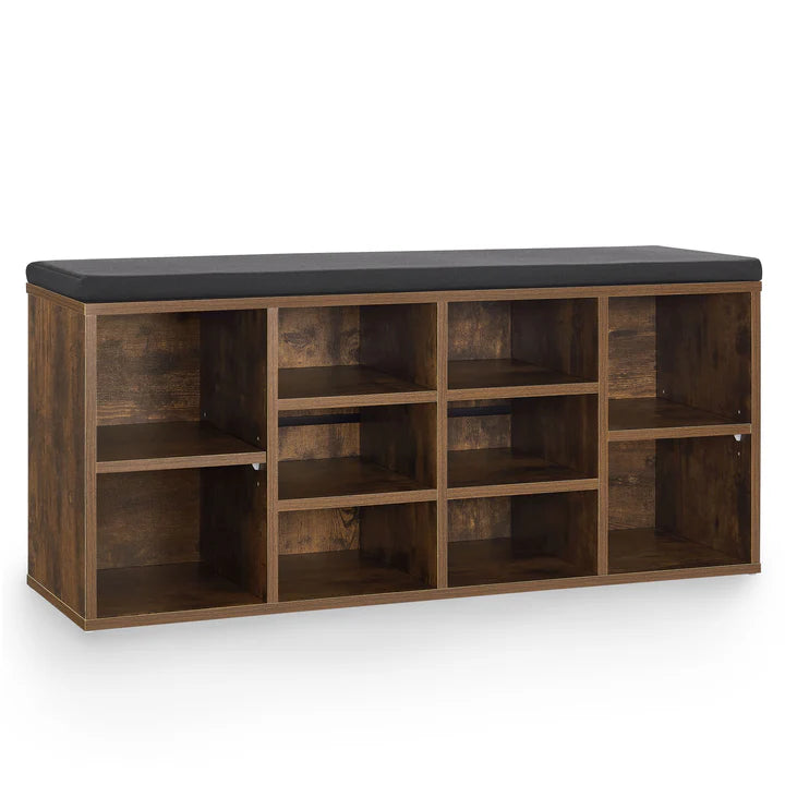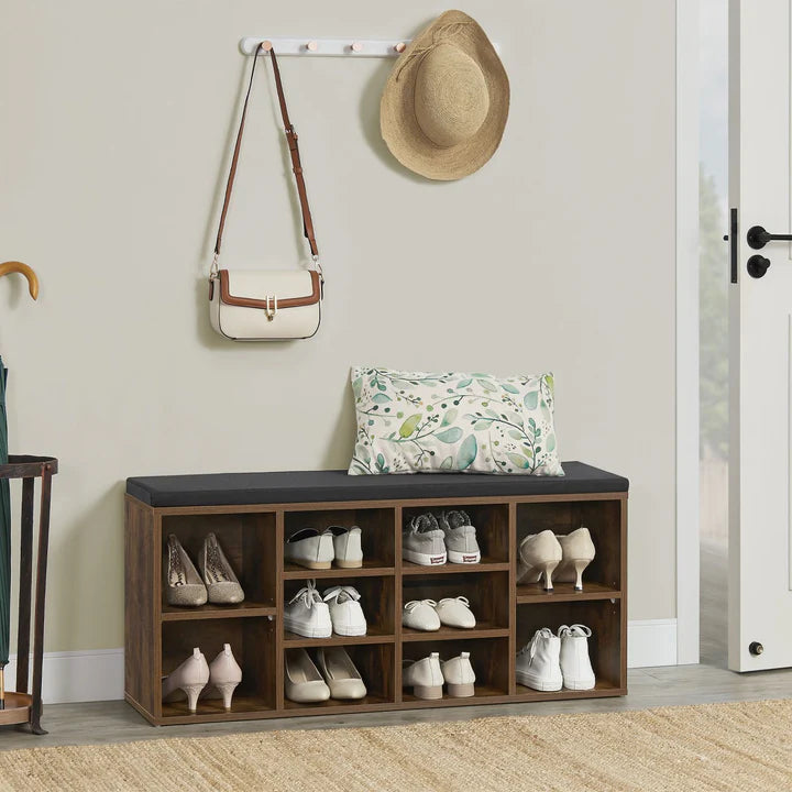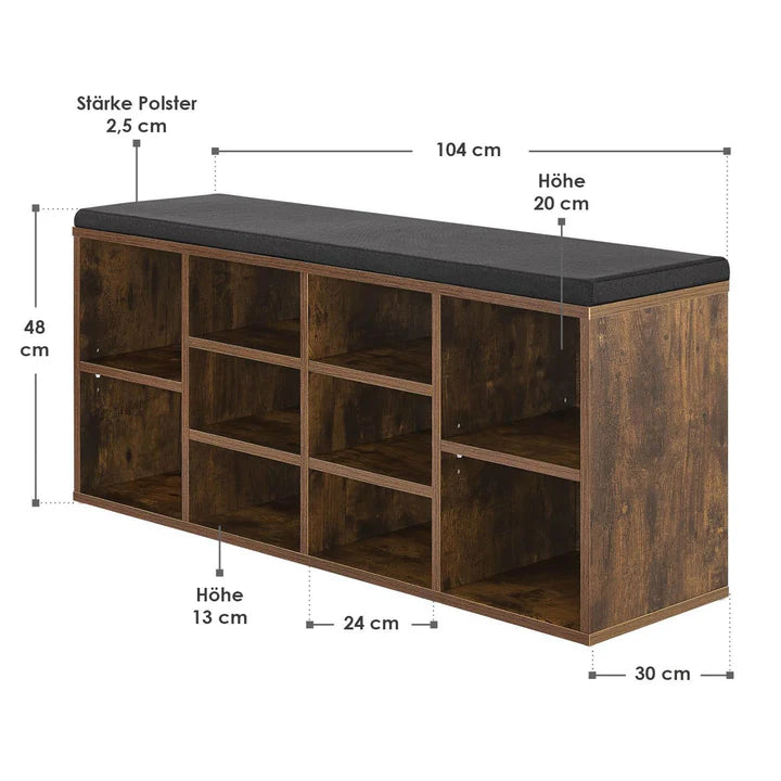 Das große Schuhregal aus Holz kombiniert praktischen Stauraum mit einer gemütlichen Sitzgelegenheit. Ob im Flur, der Küche oder im Wohnbereich, die 10 unterschiedlich großen Fächer bieten ausreichend Platz für Straßenschuhe, High Heels und Wanderstiefel. Alternativ lässt sich der Schrank auch als Vorratslager oder zum Aufbewahren von Spielzeug, Büchern oder Sammlerobjekten verwenden. Das bequeme und abnehmbare Polster verwandelt das Regal in eine gemütliche Sitzbank zum Verweilen oder Schuhe an- und ausziehen. Ohne Sitzkissen, dient die Bank als Lowboard für den Fernseher oder kann mit etwas Dekoration attraktiv in Szene gesetzt werden.