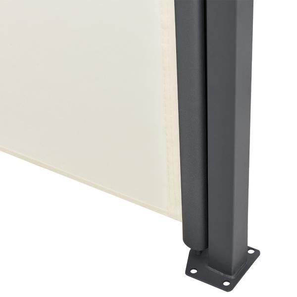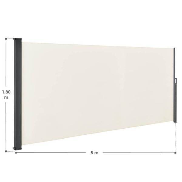 Da die Seitenmarkise in einer Kassette aufgerollt ist, können Sie den Stoff einfach auf die Länge Ihrer Wahl ausziehen. So haben Sie die Möglichkeit Ihre Markise individuell an Ihre Bedürfnisse anzupassen, um Terrasse oder Garten vor Sonne und Blicken zu schützen. Insgesamt weist die moderne Stellwand eine Höhe von 1,80m und eine maximale Länge von 5m auf.