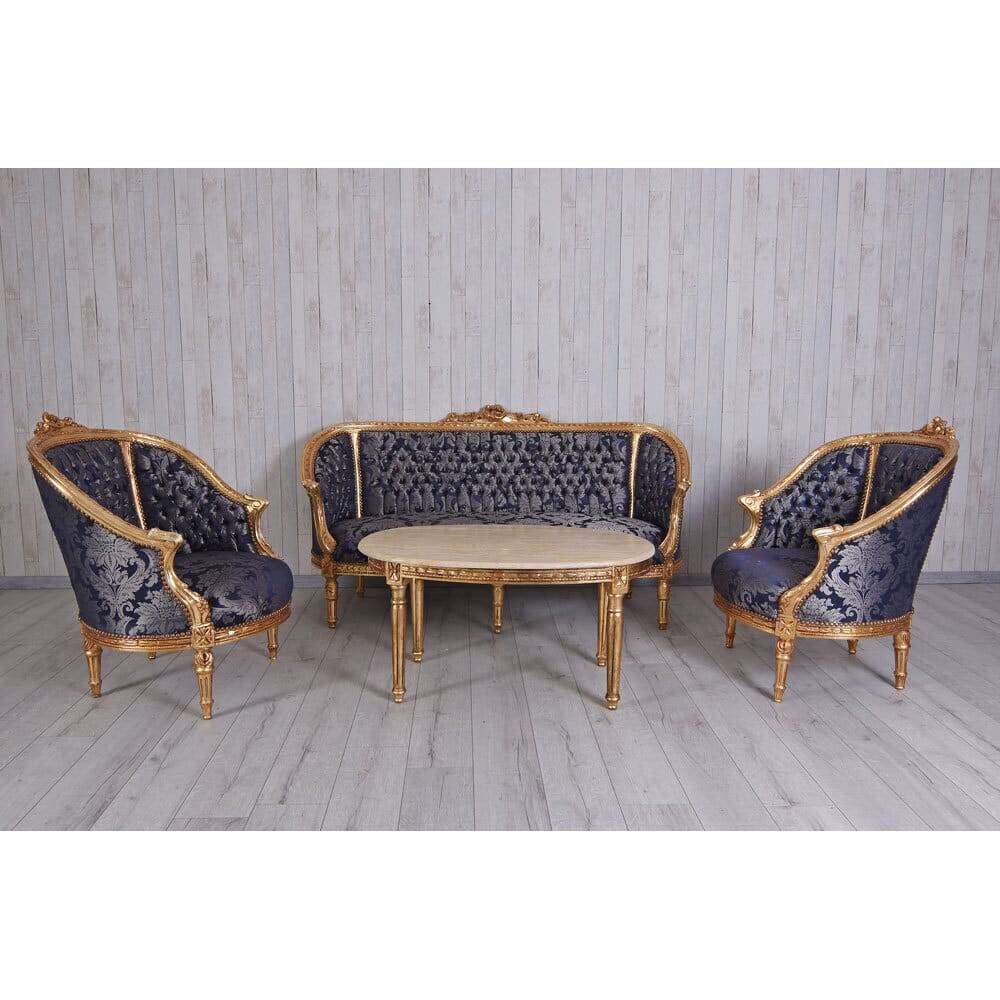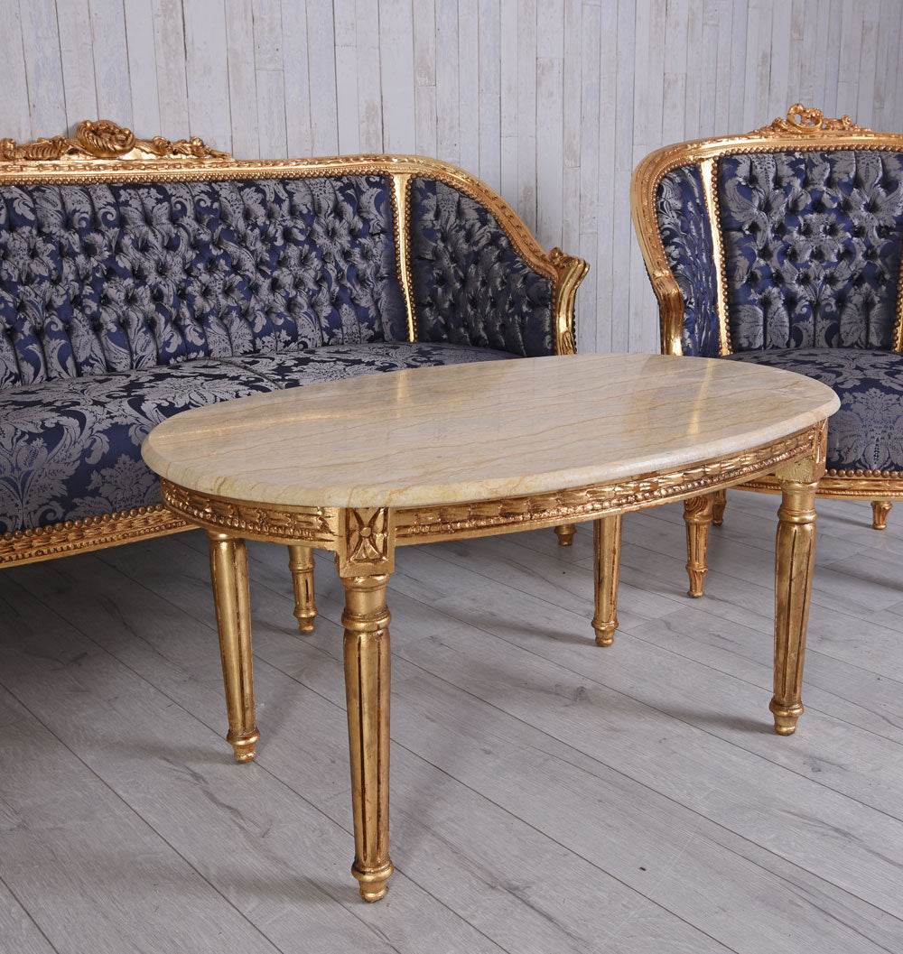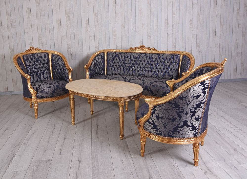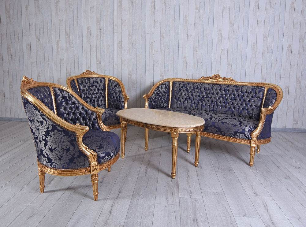 Sitzgarnitur 4-teilig Sitzgruppe Barock Sofa 2 Sessel Couchtisch Marmortisch