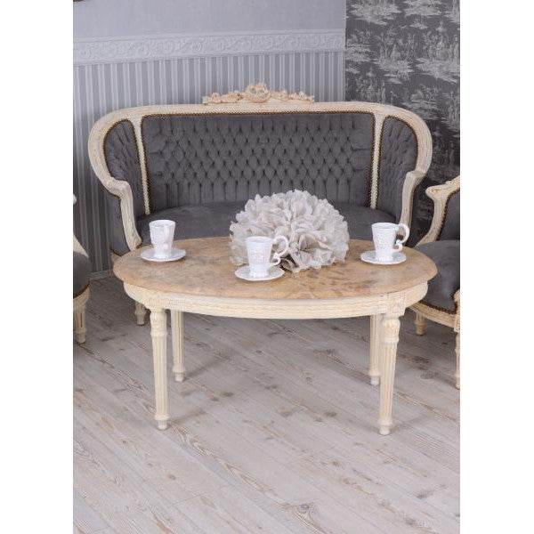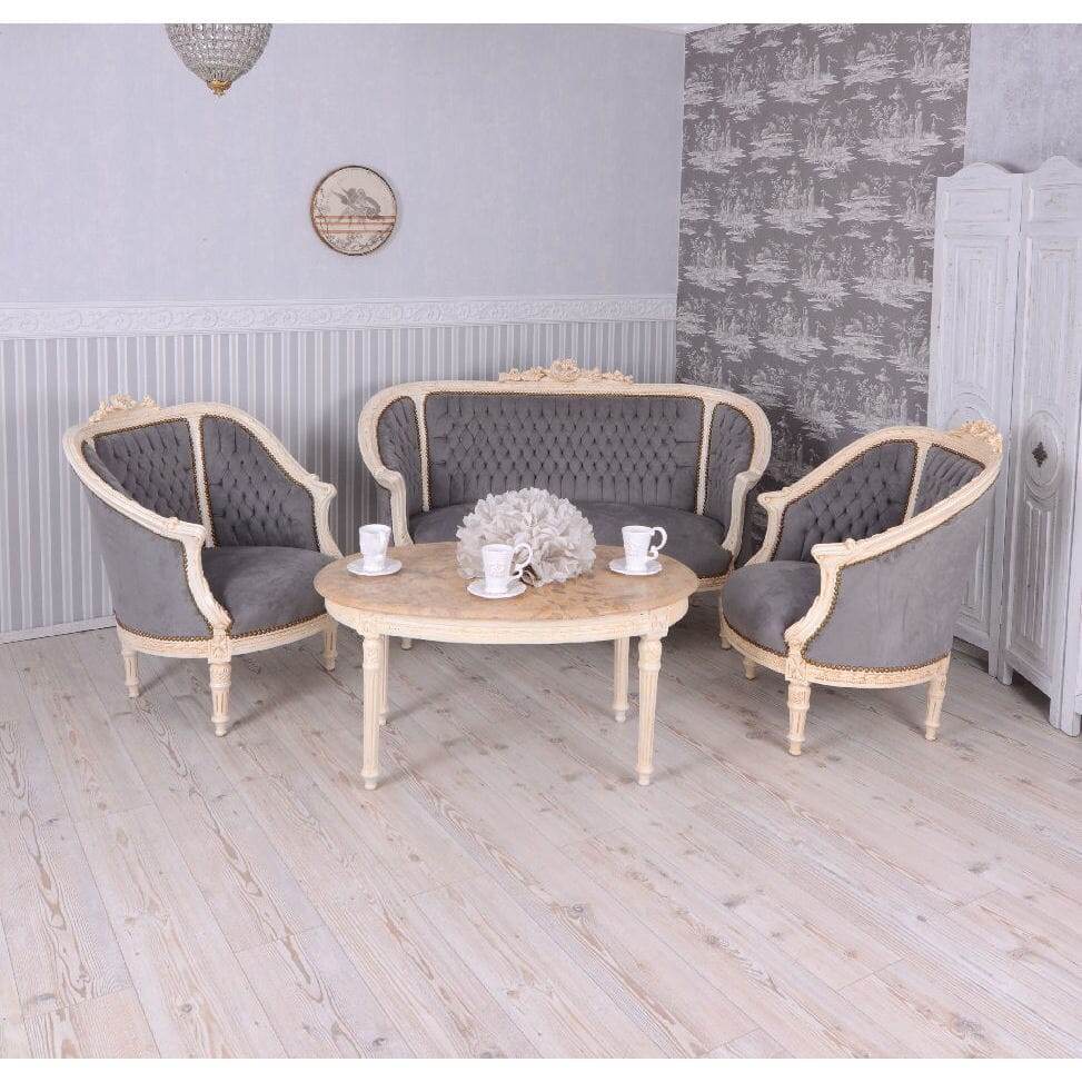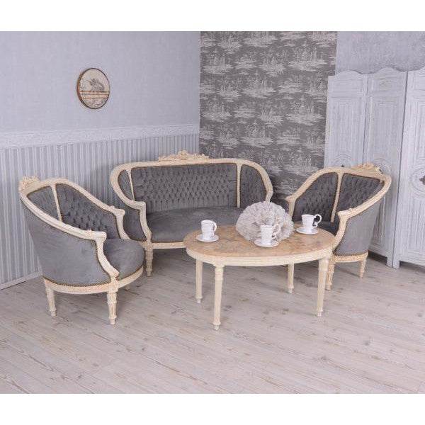 Ein Sofa & zwei Sessel & passender Couchtisch mit aufgelegter Marmorplatte im Rokoko Stil.