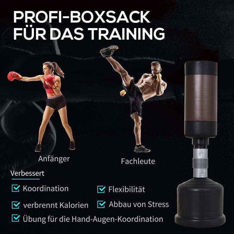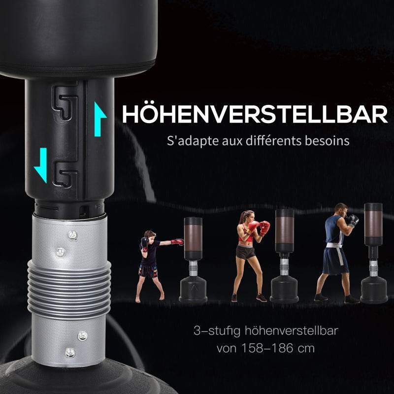 Mit diesem robusten Standboxsack von HOMCOM trainieren Sie zu Hause ganz wie im Boxgym! Der Boxsack ist dreifach höhenverstellbar zwischen 158 cm und 186 cm und mit einer optimalen Polsterung versehen. Auf diese Weise werden Ihre Schläge schonend abgefangen, um Ihre Gelenke zu schonen und Verletzungen zu vermeiden. Der robuste Standfuß ist wahlweise mit Sand oder Wasser befüllbar und hält den Boxsack stabil, während er durch die Schläge vor- und zurückschwingt.