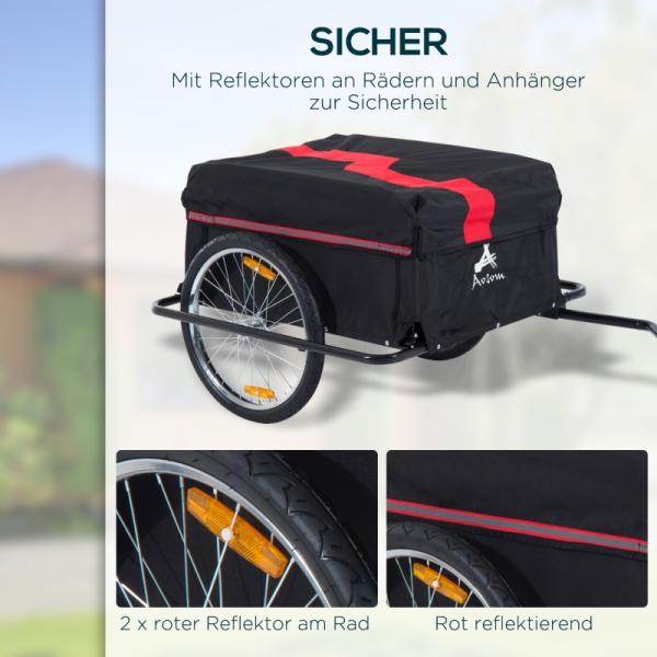 - Gesamtdaten: Gesamtmaße: L140 x B88 x H60 cm, Transportboxmaße: L84,5 x B61 x H38 cm, Farbe: Rot+Schwarz, Material: Stahl, Oxford, Max. Belastbarkeit: 40 kg. Der Anhänger ist geeignet für 20" bis 26" Fahrräder.