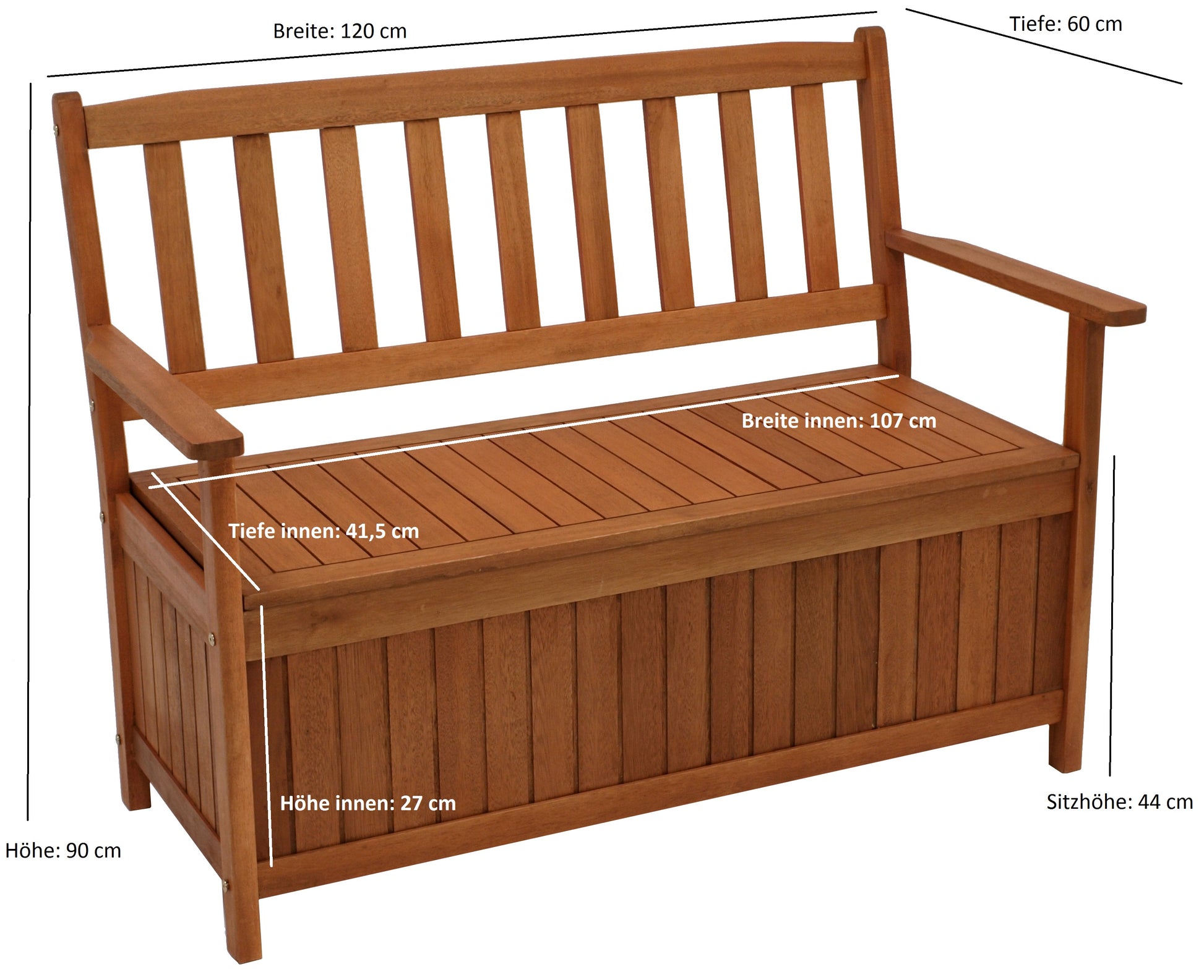 Diese elegante Truhenbank ist aus hochwertigem Eukalyptus - Hartholz gefertigt. Sie bietet viel Stauraum um beispielsweise Auflagen oder Kissen aufzubewahren. Die im Rückenteil eingesetzten Holzstreben verleihen der Bank eine sehr ansprechende Optik. Gleichzeitig ist die Bank besonders stabil und solide.