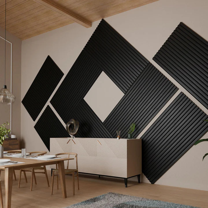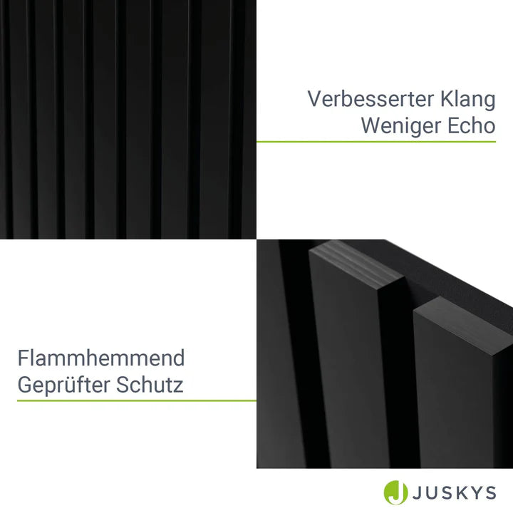 Verleihen Sie Ihren Räumen eine stilvolle und funktionale Note mit den Akustikpaneelen im 4er Set in Schwarz. Diese hochwertigen Holzpaneele bieten nicht nur ein elegantes Design mit edlem Holzfurnier, sondern auch eine herausragende Schallabsorption gemäß EN ISO 11654. Dank der Akustik-Baumwolle reduzieren sie effektiv Hall und Lärm in Innenräumen und schaffen so eine angenehmere Atmosphäre. Die flammhemmende Eigenschaft nach EN 13501-1 sorgt zudem für zusätzliche Sicherheit. Perfekt als Wandverkleidung, um sowohl Ästhetik als auch Akustik zu optimieren!