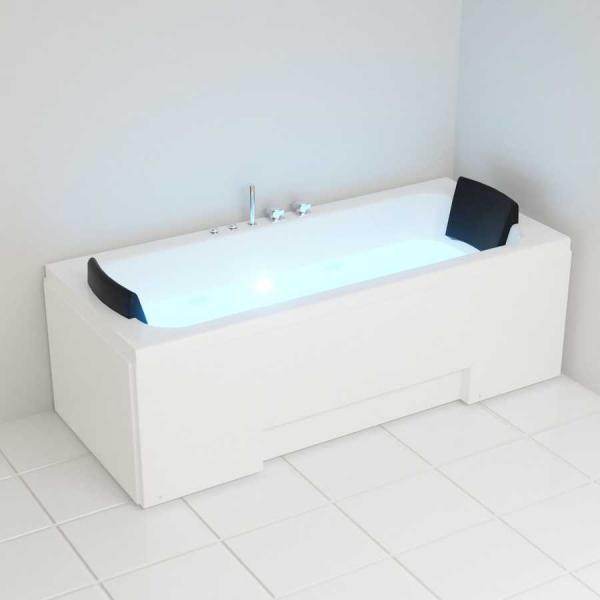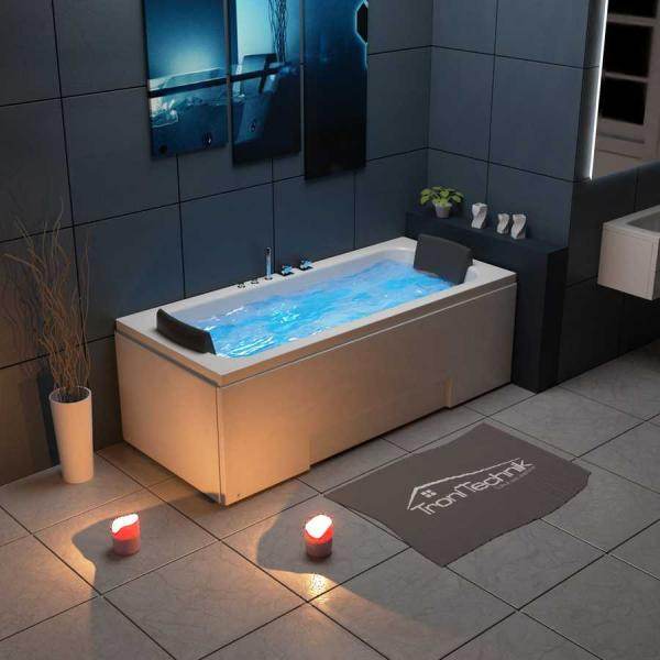 Unsere Whirlpool Badewanne IOS passt aufgrund der kompakten Außenmaße in nahezu jedes Badezimmer. Dabei haben Sie nicht nur die beliebten Eigenschaften einer herkömmlichen Badewanne, sondern können über einen Schalter die Whirlpoolfunktion aktivieren. In diesem Zug schaltet sich ebenfalls die integrierte Unterwasser LED Farblichttherapie ein, welche für eine besondere Atmosphäre sorgt. Dank der zwei mitgelieferten Kissen steht auch einem Bad mit 2 Personen nichts mehr im Weg. Damit die Armaturen von beiden Liegeflächen bequem zu erreichen sind, wurden diese mittig platziert. Da sich die Schürzen demontieren lassen, ist auch eine Installation in einer Ecke problemlos möglich. Selbstverständlich können Sie unsere IOS auch mithilfe eines Durchlauferhitzers betreiben. Insgesamt verfügt das Whirlpool Modell IOS über 8 hochwertige Düsen. 4 große und extra flache Düsen lassen sich in der Intensität stufenlos regulieren und bei Bedarf auch herausschrauben. Die 4 kleinen Düsen im Rückenbereich wurden ebenfalls im Acryl eingearbeitet, damit diese nicht das Liegen beeinträchtigen. Die Hydromassage (Wasser-/ Luftsystem) lässt sich stufenlos über einen Drehregler steuern und sorgt für ein besonderes Massageerlebnis. Vorteile einer Farblichttherapie: Die Farblichttherapie bietet Wohlbefinden und sorgt für eine besondere Atmosphäre. Inzwischen ist nachgewiesen, dass sich Farben bis auf die körperliche Ebene auswirken können. Früher wurde dieser Ansatz eher belächelt. Mittlerweile liegen harte Fakten vor, sodass sich die Farblichttherapie heute in der Medizin etabliert hat. Die verschiedenen Farben wirken sich unterschiedlich auf den Körper aus und werden daher auch bei unterschiedlichsten Beschwerden eingesetzt. Bei diesem Produkt haben wir die Farblichttherapie installieren lassen. Vorteile von TroniTechnik Whirlpool Badewannen: